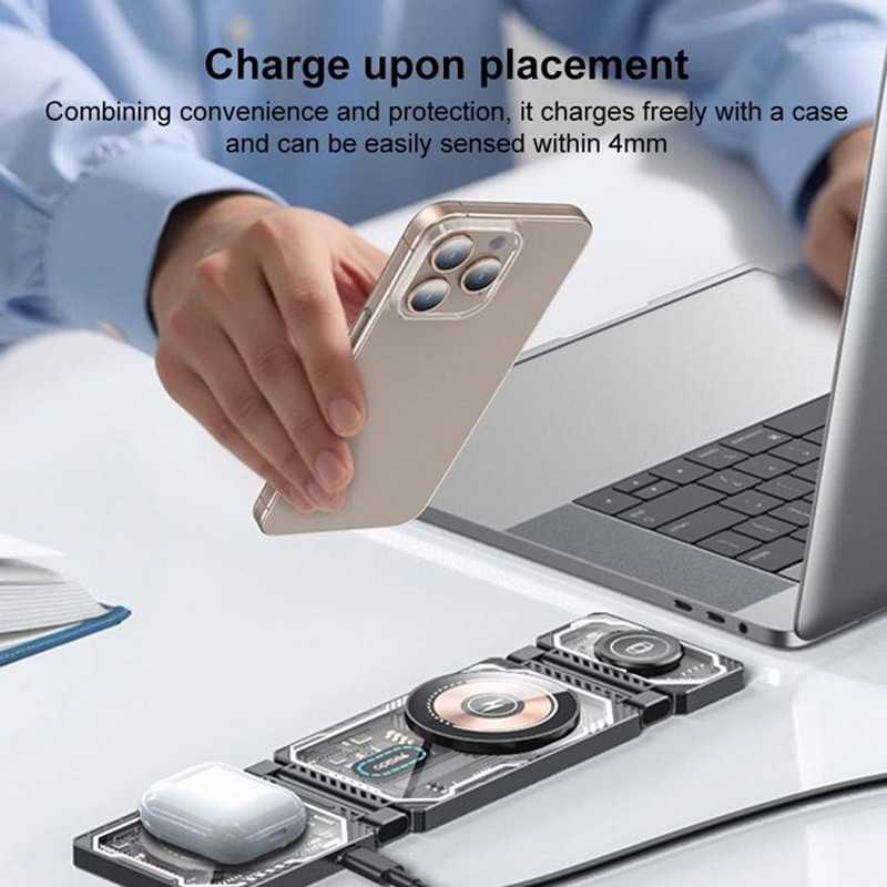 Tato kompaktní a skládací nabíjecí stanice je dokonalým společníkem pro domácnost, kancelář nebo cestování, protože může současně nabíjet telefon, chytré hodinky a bezdrátová sluchátka.