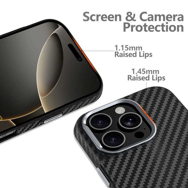 Pouzdro je vyrobeno z odolného polykarbonátu (PC) a poskytuje účinnou ochranu před poškrábáním, nárazy a každodenním opotřebením. Karbonová povrchová úprava mu dodává jedinečný charakter a zdůrazňuje dynamický a stylový vzhled.