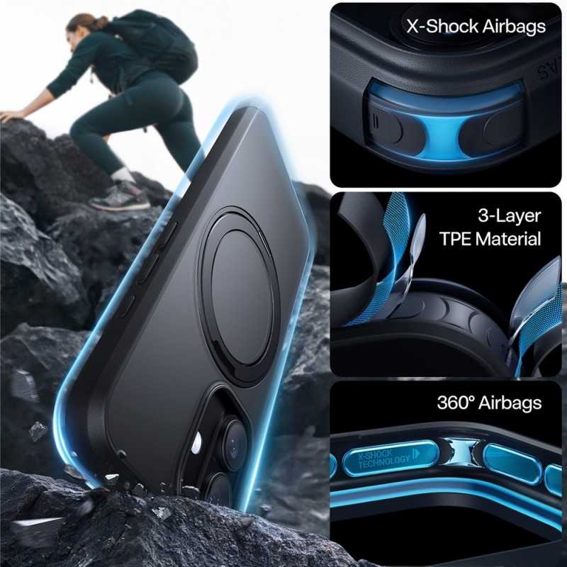 Vestavěný kroužek v pouzdře Torras Ostand Pro MagSafe Series plní dvojí roli. Můžete jej použít jako pohodlný úchop pro bezpečné držení telefonu v jakékoli situaci, čímž se minimalizuje riziko náhodného upuštění. Kroužek navíc slouží jako funkční stojánek, který vám umožní umístit telefon do ideálního úhlu pro sledování videí, videohovory nebo focení. Díky 360° rotaci a přesnému mechanismu je každá změna úhlu plynulá a stabilní.