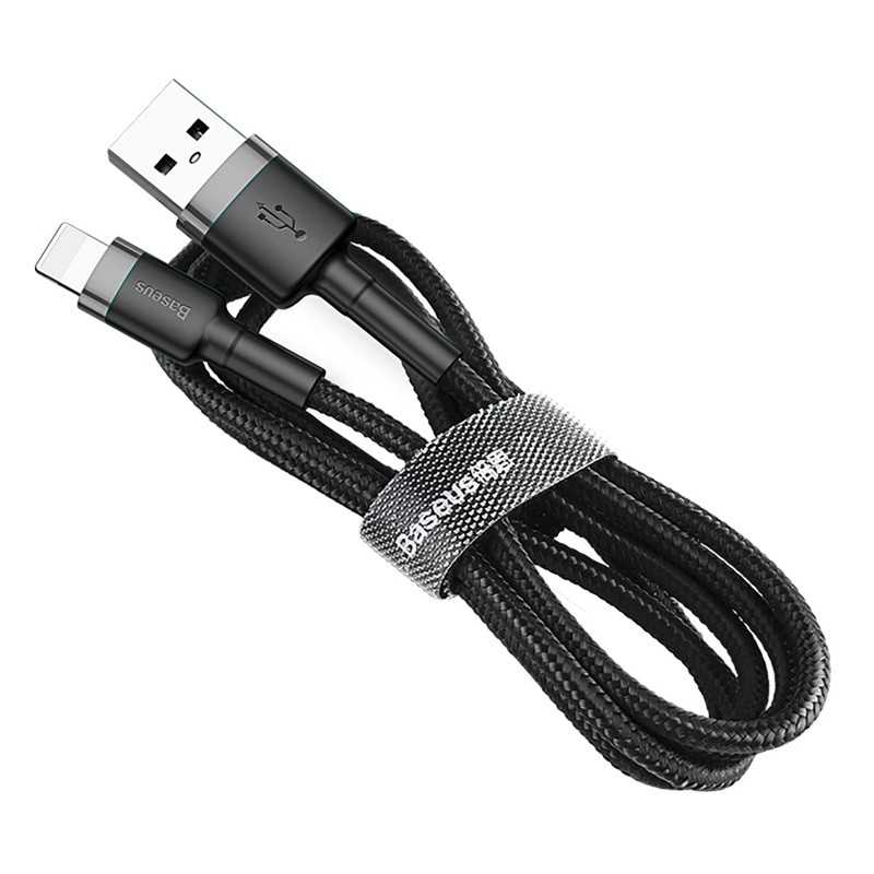 Kabel Baseus Cafule USB-A / Lightning QC 3.0 2,4A. Rychlé nabíjení, kabel z čisté mědi, nylonový oplet, hliníkové zástrčky, zesílené připojení. Délka: 1 m. Barva: černá a šedá.