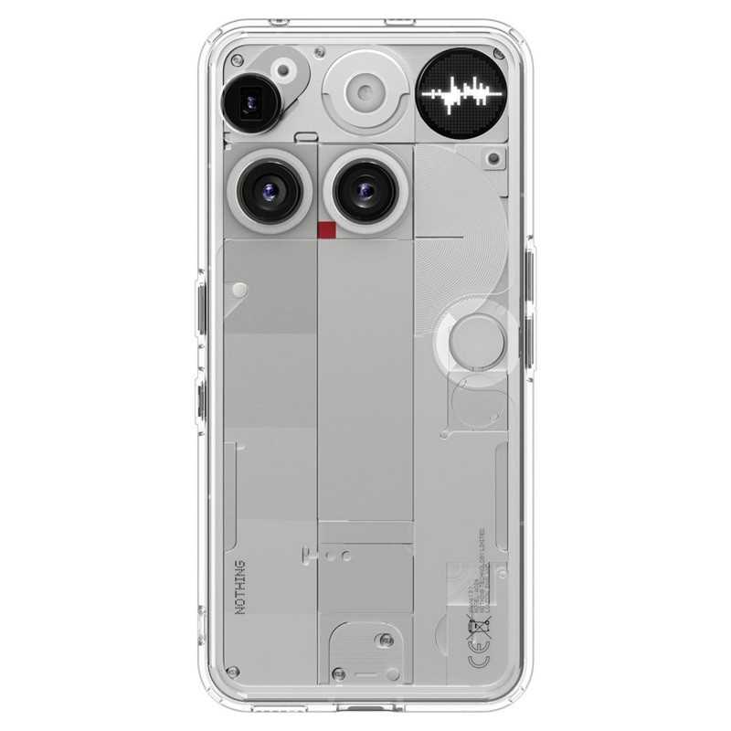 Mírně zvýšené okraje kolem obrazovky a fotoaparátu chrání tyto prvky před přímým kontaktem s rovným povrchem, zatímco precizně provedené výřezy umožňují snadný přístup ke všem portům, tlačítkům a funkcím telefonu Nothing Phone (3).