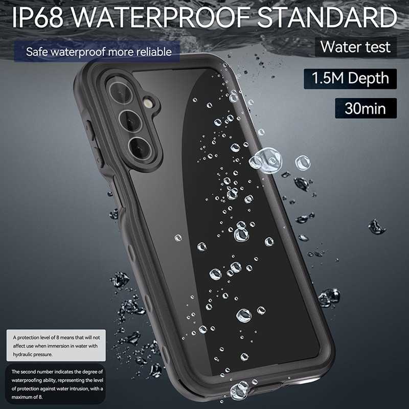 Vodotěsné pouzdro pro Samsung Galaxy A17 4G / A17 5G s krytím IP68 je pouzdro, které chrání zařízení před vodou, prachem a nečistotami. Má certifikaci IP68, což znamená, že vydrží ponoření do vody až do hloubky 2 metrů. Pouzdro se skládá ze dvou částí: předního rámečku a zadního krytu. Díky těsnění a krytům portů si můžete být jisti, že Váš smartphone Samsung Galaxy A17 4G / A17 5G bude v bezpečí. Je ideální pro ty, kteří chtějí telefon používat ve vodě, ale i na pláži bez obav z vody a písku.
